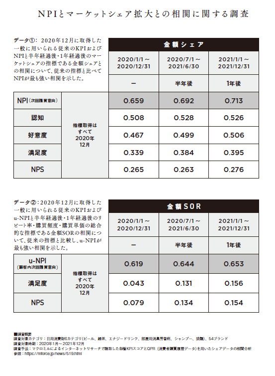 各表における左列は、2021年3月に発表した数値です。引き続きその半年後(中央列)、さらに今回発表した1年後(右列)の調査でも、マーケットシェアの指標である金額シェアとの相関について、従来の指標と比べてNPIが最も強い相関を示し、また、リピート率・購入頻度・購入単価の総合的な指標である金額SORとの相関について、u-NNPIが最も強いという結果が得られました。
