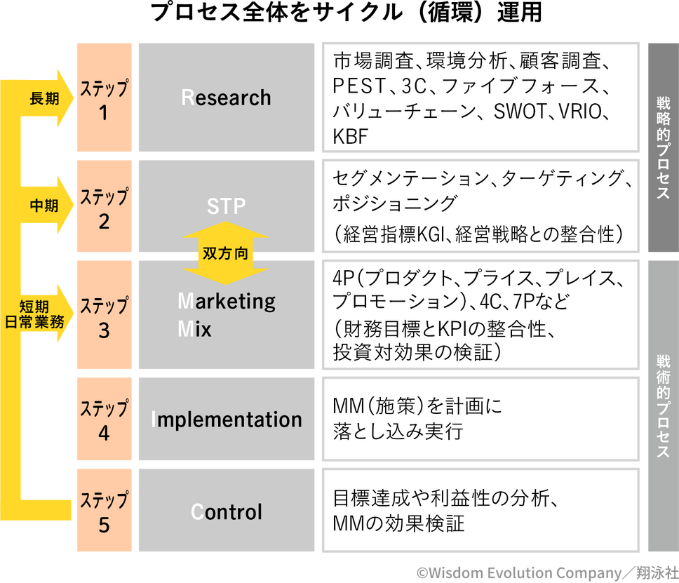 前提として、マーケティングプロセス(R-STP-MM-I-C)は以下の図のように、R(Research)、STP(Segmentation、Targeting、Positioning)、MM(Marketing Mix)、I(Implementation)、C(Control)で構成されています。これは一方通行ではなく、ステップ1のリサーチから始めて、ステップ5のコントロール(分析、効果検証)まで進んだら、またステップ1 に戻るという循環構造になっています。また、とりわけSTPとMMは双方向であることも留意すべき点です。