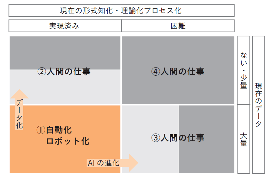 前項では、AIに任せられる仕事と人間が担うべき仕事について、四象限で考察しました。本項では、それぞれの象限①~④において、どういった業界でどのような代替や協業が進んでいるのか、事例で紹介します。