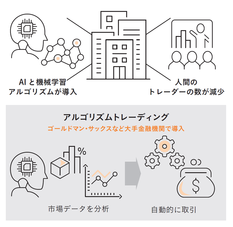 金融業界では、AIと機械学習アルゴリズムが導入され、データ分析や取引業務の自動化が進んでいます。これにより、リスク評価、クレジットスコアリング、トレーディングなどの作業が人間の手を借りずに行われるようになっています。ゴールドマン・サックスなどの大手金融機関では、アルゴリズムトレーディングが普及しており、人間のトレーダーの代わりにAIが市場データを分析し、自動的に取引を行っています。これにより、取引のスピードと正確性が向上し、人間のトレーダーの数が減少しています。