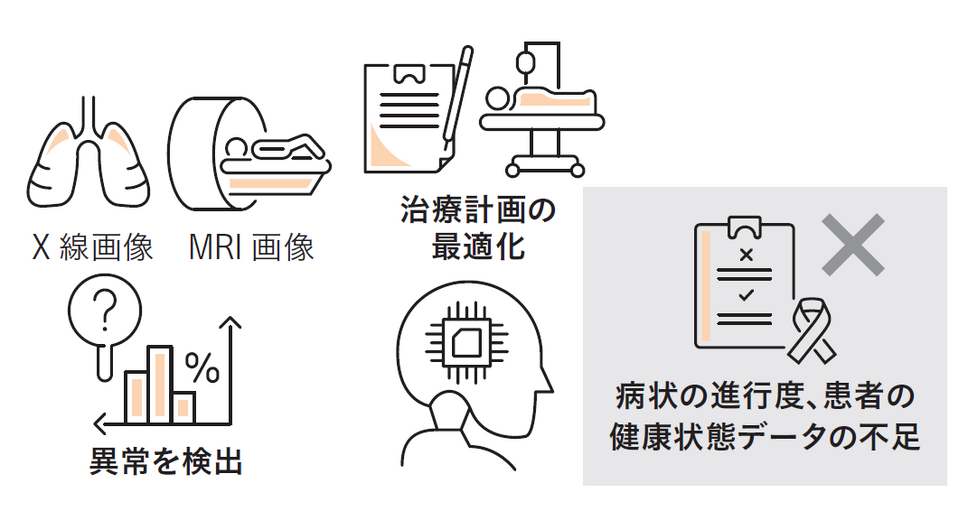 医療では、X線画像やMRI画像を解析し、異常を検出する技術が発展しています。しかし、各病院の診断データ、治療結果のデータが十分ではなく、AIによる統合的な診断や治療計画の自動化までに至っていません。