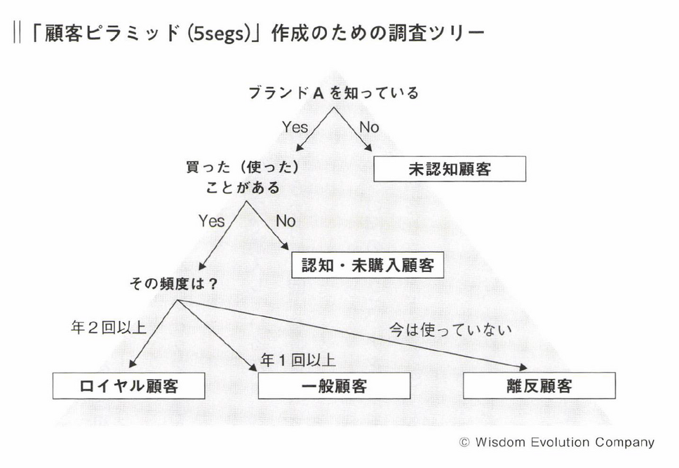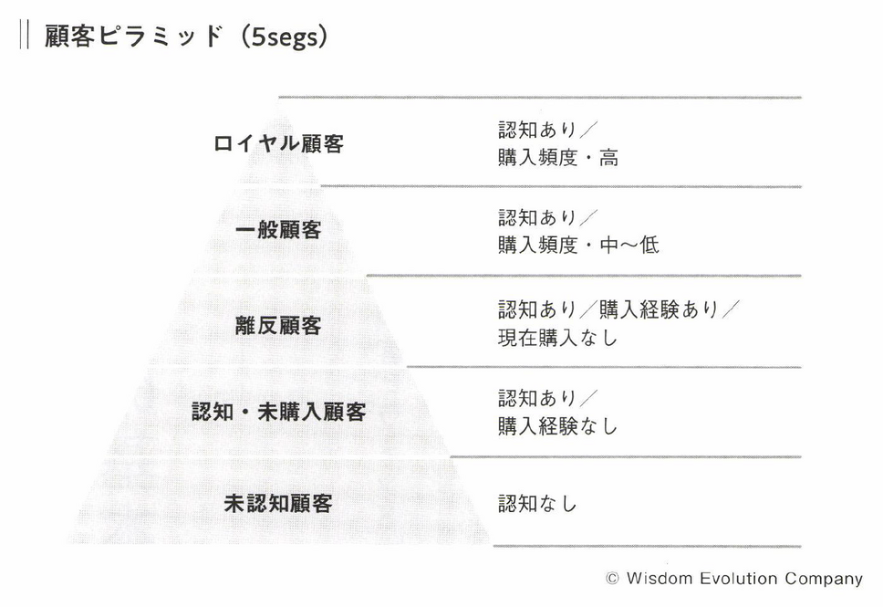 企業やブランドによってさまざまな顧客の分類が行われており、筆者もこれまで多様なフレームワークを試してきましたが、最もシンプルで汎用性が高いのが「5segs(ファイブセグズ)/顧客ピラミッド」です。