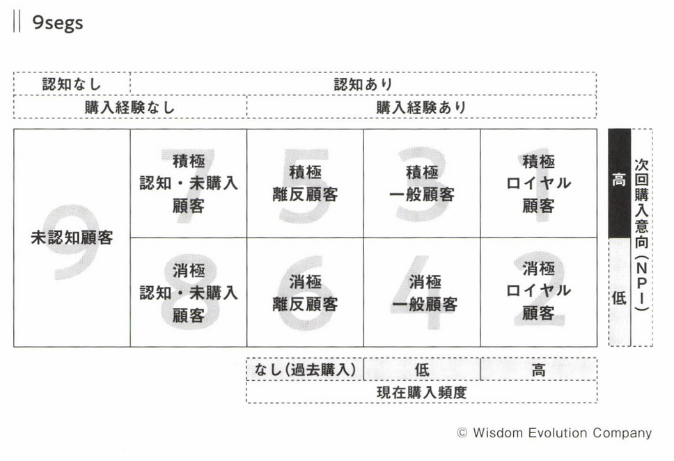 先の「5segs/顧客ピラミッド」に、この「次回購入意向(NPI)」の質問を加えて分類したのが「9segs(ナインセグズ)」です。「5segs」の「ロイヤル顧客」「一般顧客」「離反顧客」「認知・未購入顧客」の4層を「次回購入意向(NPI)」の有無で8つに分類します。そこに未認知顧客を足して、9つになります。
