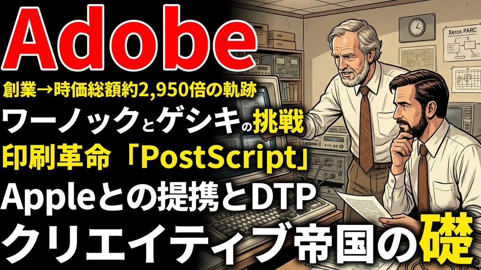 アドビは1982年にアメリカで誕生しました。1986年にNASDAQへ上場し、上場時の時価総額は約7,800万ドルでしたが、2024年度の最終取引日時点では約2,300億ドルに達し、約2,950倍の成長を遂げています。今ではPhotoshopやIllustratorなどのツールで世界的に知られるソフトウェア企業ですが、その成功は革新的な技術と戦略的な製品開発によって築かれました。