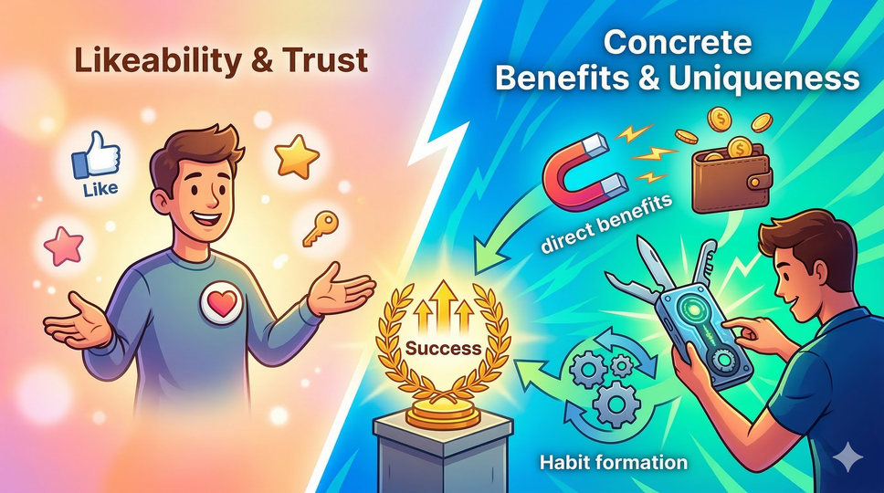好感度、信頼度、親近感が高まったから商品・サービスを買うという人は少数です。商品・サービスの具体的な便益と独自性に顧客が価値を感じて、実際の使用においてその価値を再評価するから、好感度や信頼度が高まります。因果関係の理解を誤っています。
