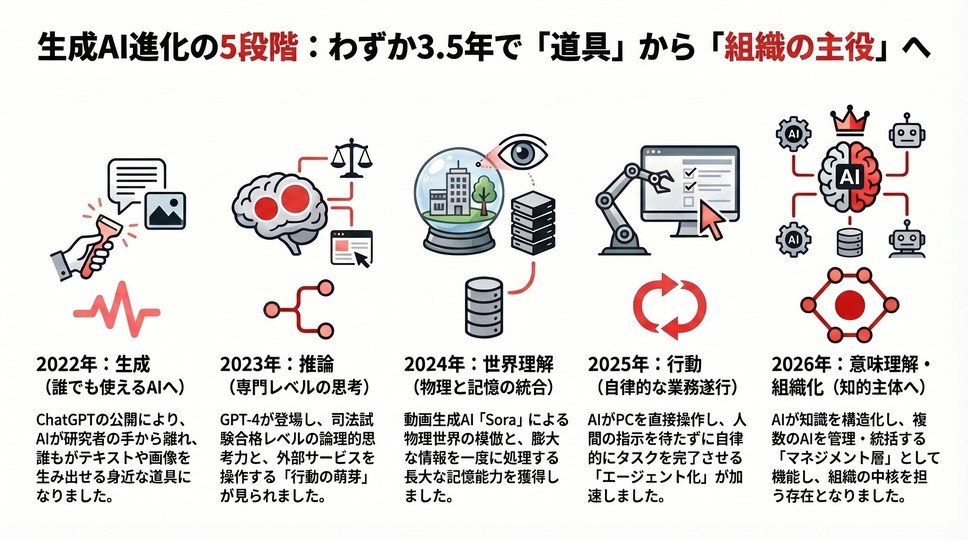 この解説では、その歩みの中から特に重要な31項目を、時系列でまとめています。「生成→推論→世界理解→行動→意味理解・組織化」という5段階の質的転換が、わずか3年半という驚くほど短い期間に起きたことを、あらためて確認していただけると思います。