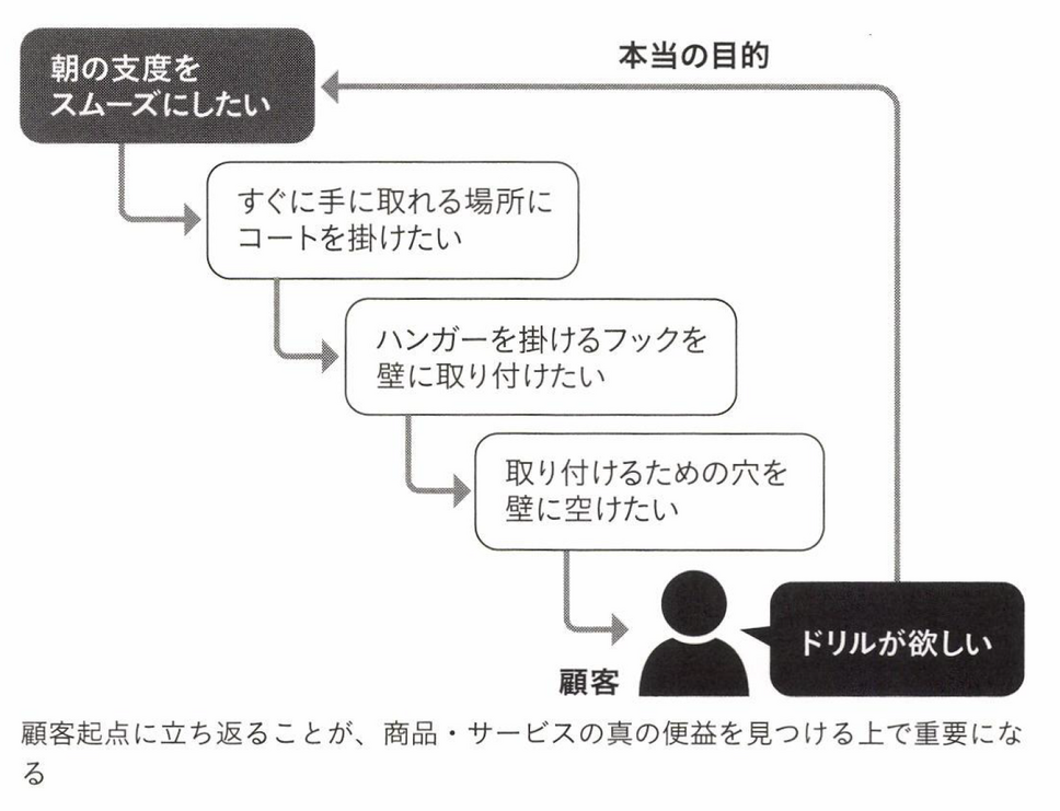 そこで顧客起点に立ち返り、「なぜ、その人は穴を開けたいのか」を考えます。もし、ハンガーを掛けるフックを壁に設置するために壁に穴を開けたいのなら、目的は服を掛けることなのだから、スタンド型のコート掛けも選択肢に含まれるかもしれません。