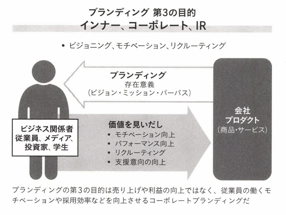 そして、ブランディングの第3の目的は、顧客に直接「商品・サービスを売る」という目的ではなく、いわゆる「インナーブランディング」「コーポレートブランディング」「IRブランディング」です。ここでの対象は顧客ではなく、ビジネスの関係者や従業員、メディア、株主や投資家、学生などです。彼らに「この企業で働いてみたい」「応援したい」「投資したい」と感じてもらうためのブランディングであり、これまで紹介した2つとは対象者(WHO)が異なります。