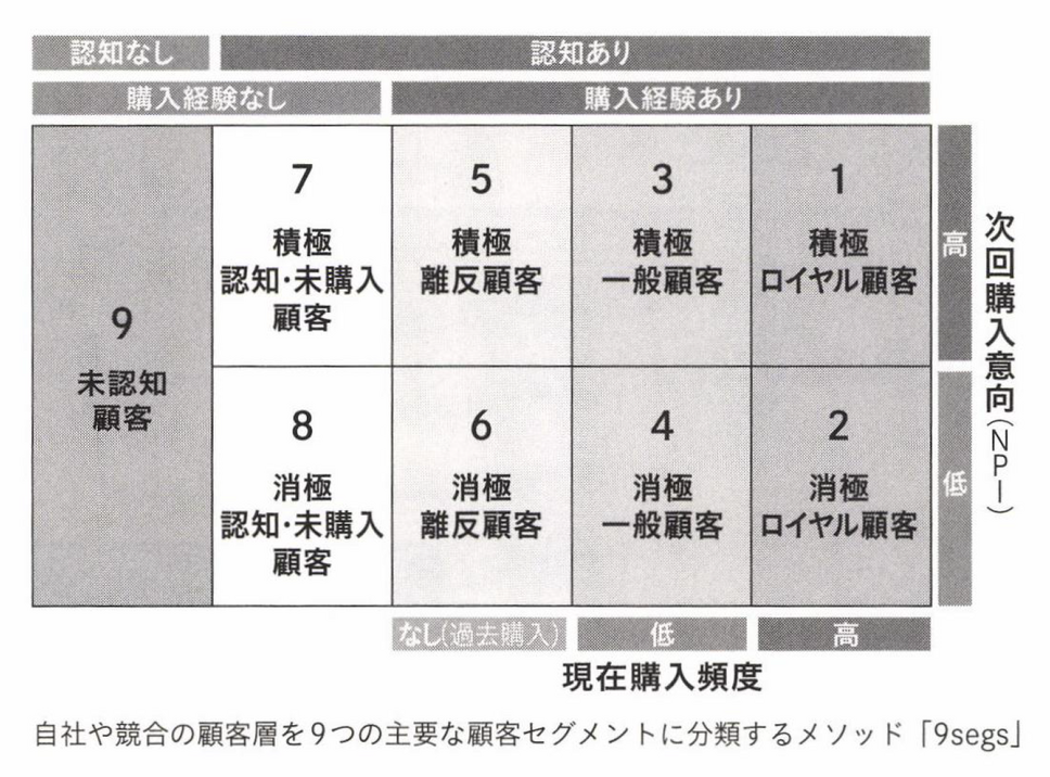 例えば、購入経験があり、購入頻度と次回購入意向がともに高い場合は「1.積極・ロイヤル顧客」に分類され、1よりも次回購入意向が低い顧客は「2.消極・ロイヤル顧客」に分類されるといった具合です。ただし、認知がなく、購入経験がない層は全て未認知顧客に分類されるため、全部で9分類となります。